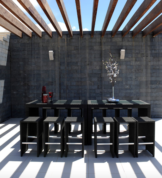These slats across the terrace allows a lot of sun light to enter the space, also giving interest and many shadows to the space. These would tend to create a nice flow from indoors, as the slats draw our eye out from standing inside, oppose to an open area which would just be an outside space. The slats make it feel like an extension.